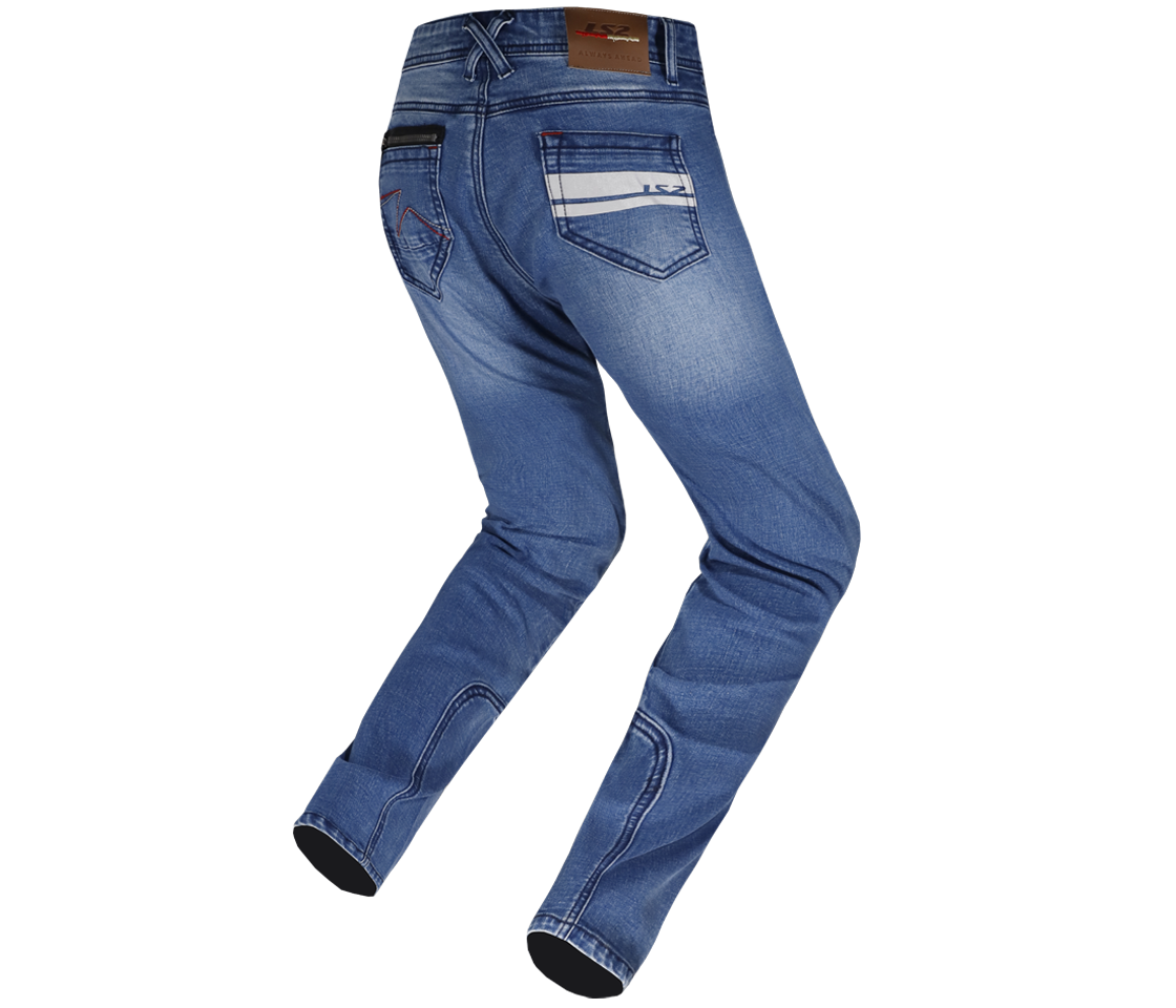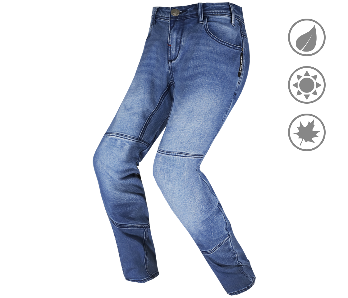 Pohodlné strečové motocyklové džínsy s kevlarovými výstuhami a nastaviteľnou ochranou na kolenách.