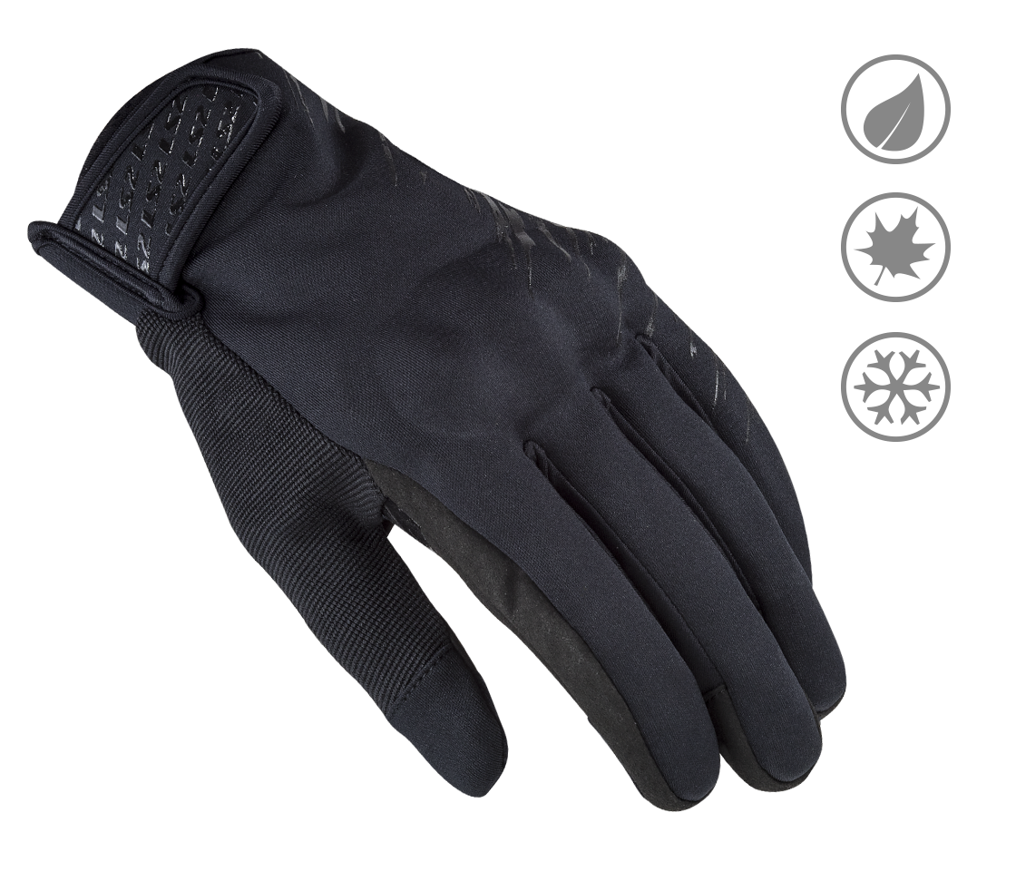 Zapínanie na suchý zips. Technológia Touchscreen na ovládanie dotykových displejov. Pružný materiál Spandex na manžetách pre ľahké navliekanie. Chrániče kĺbov. Silikónová potlač na dlaniach.