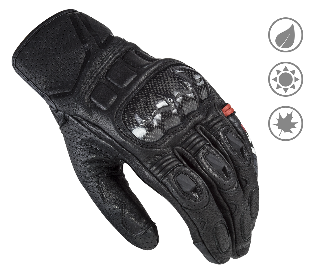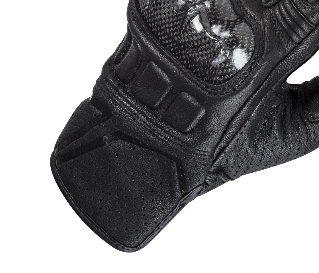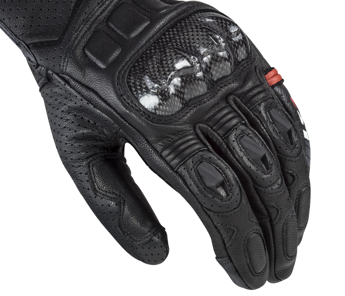 Celokožené rukavice s mäkkou dlaňou pre istý grip a karbón-kevlarovými chráničmi kĺbov a chrbta ruky.